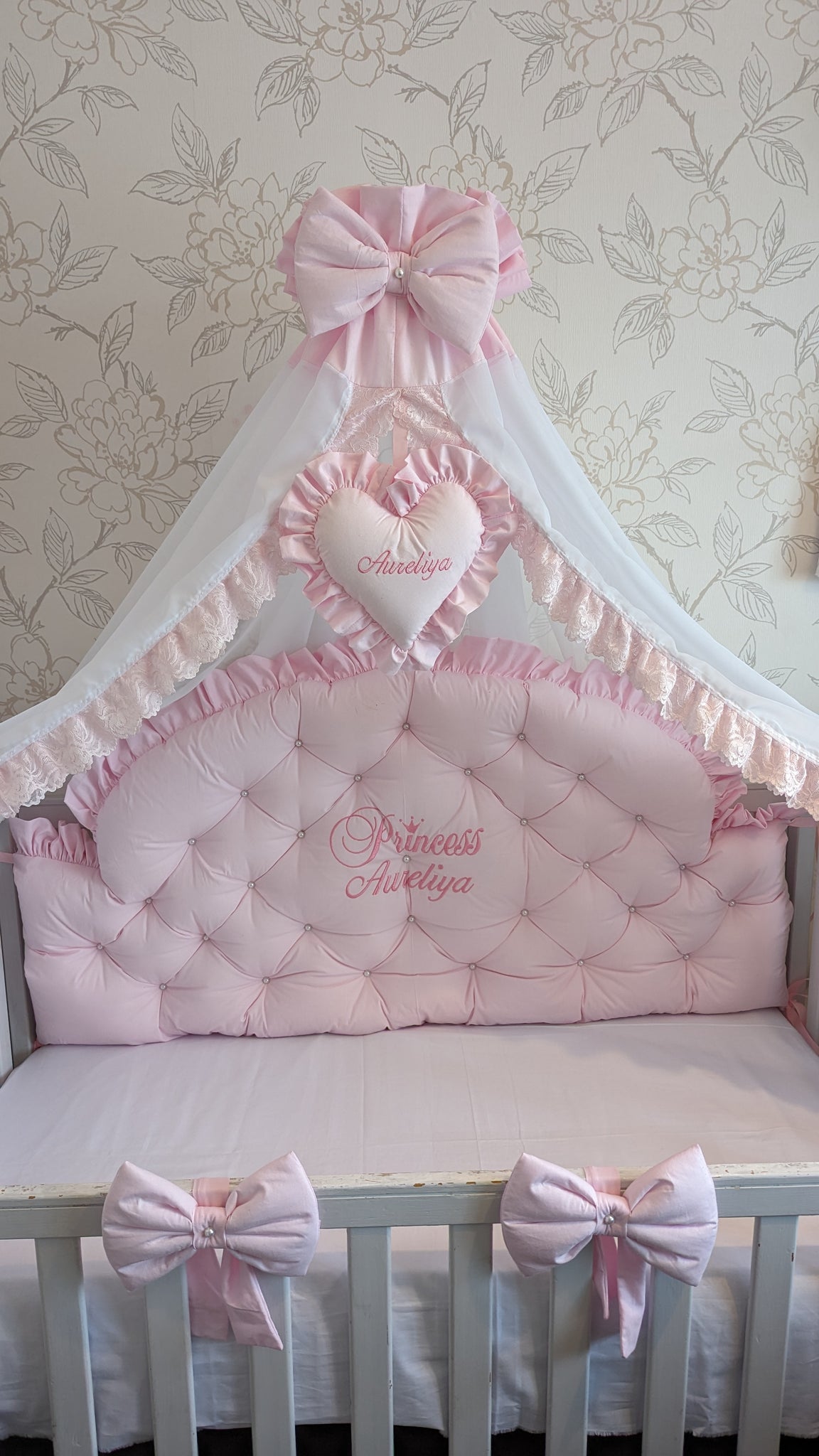 Luxury baby bedding 120x60 personalised by embroidery ✅️ 1 Bumper 120x70✅️ 2 Bows✅️ 1 Canopy with bow and heart