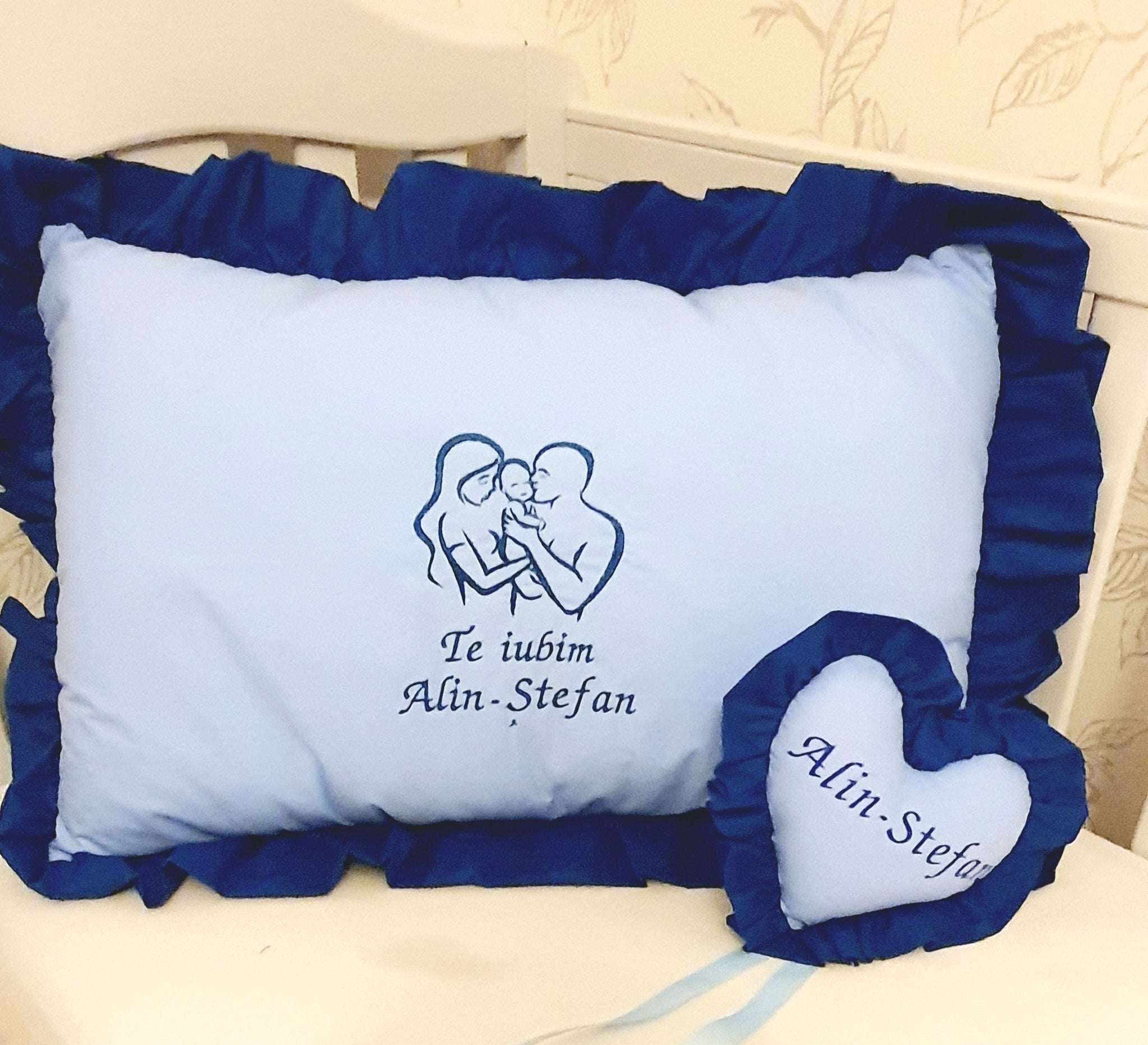 ✅️Baby pillow 60x40 personalised by embroidery ✅️ 1 Heart Pillow 20x20 personalised with vinyl